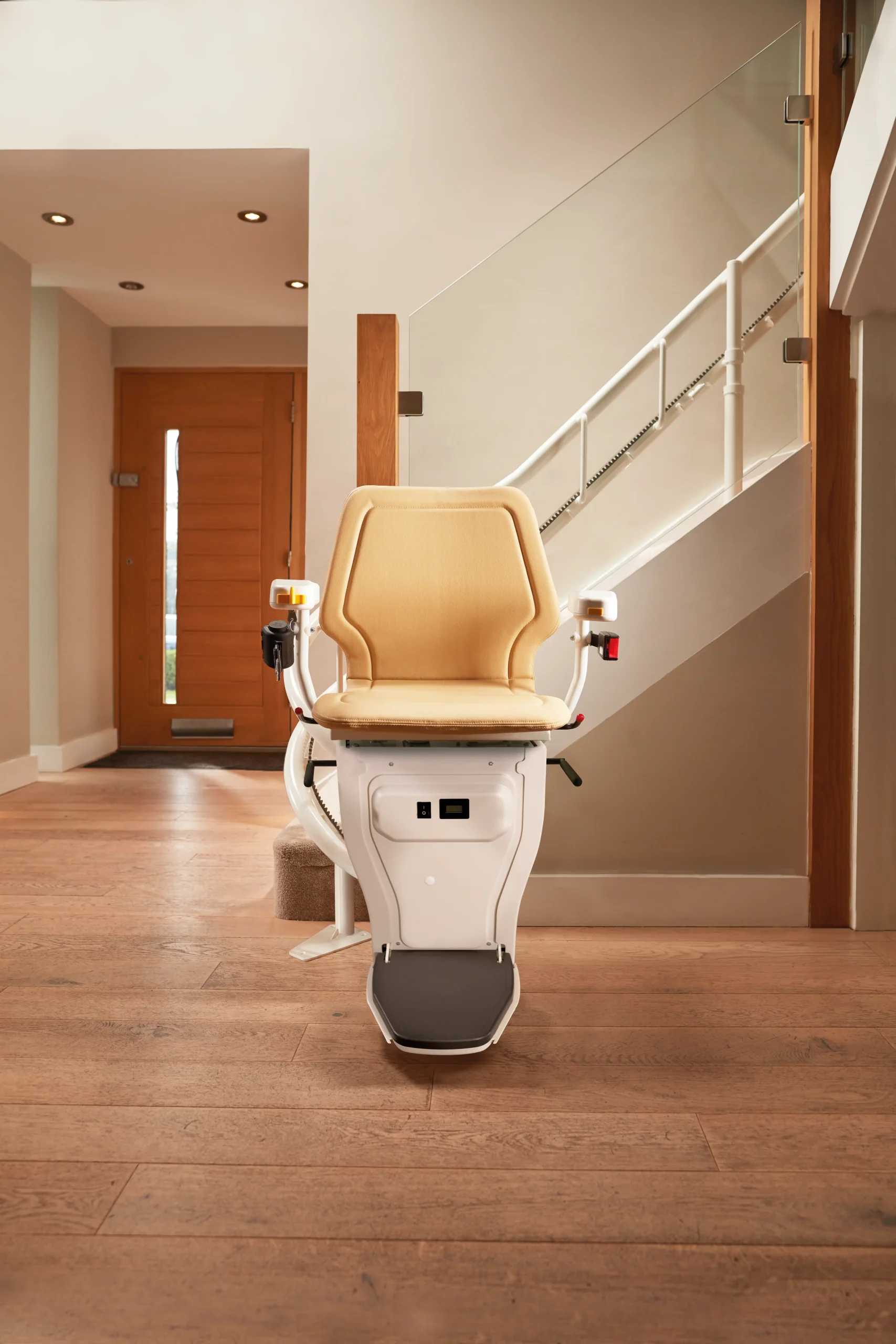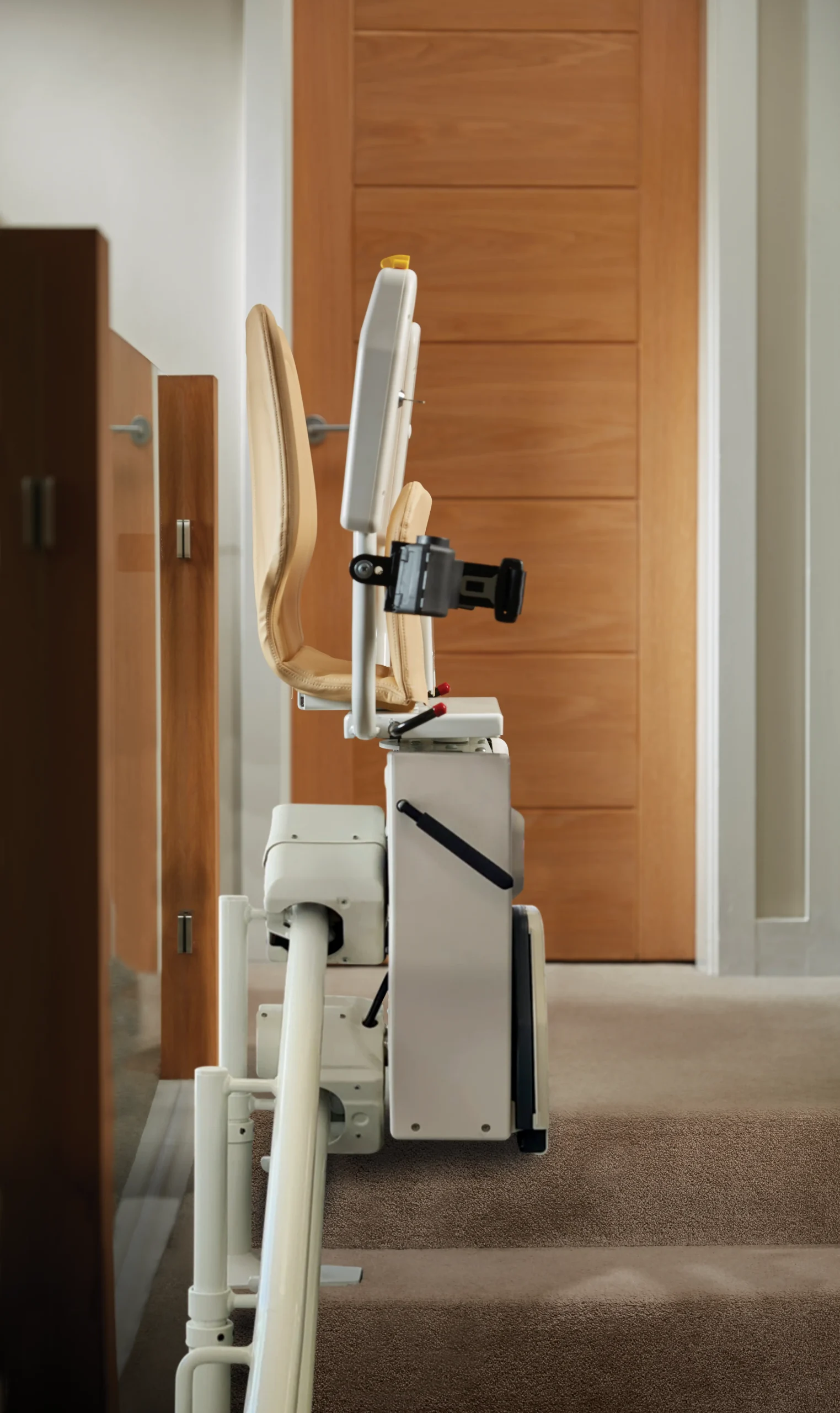 Each Infinity stairlift is custom-built to fit the exact contours of your staircase, ensuring maximum safety, precision, and reliability. Its ergonomic padded seat, intuitive controls, and quiet motor make daily use effortless, while the swivel seat allows for safe mounting and dismounting at the top of the stairs.